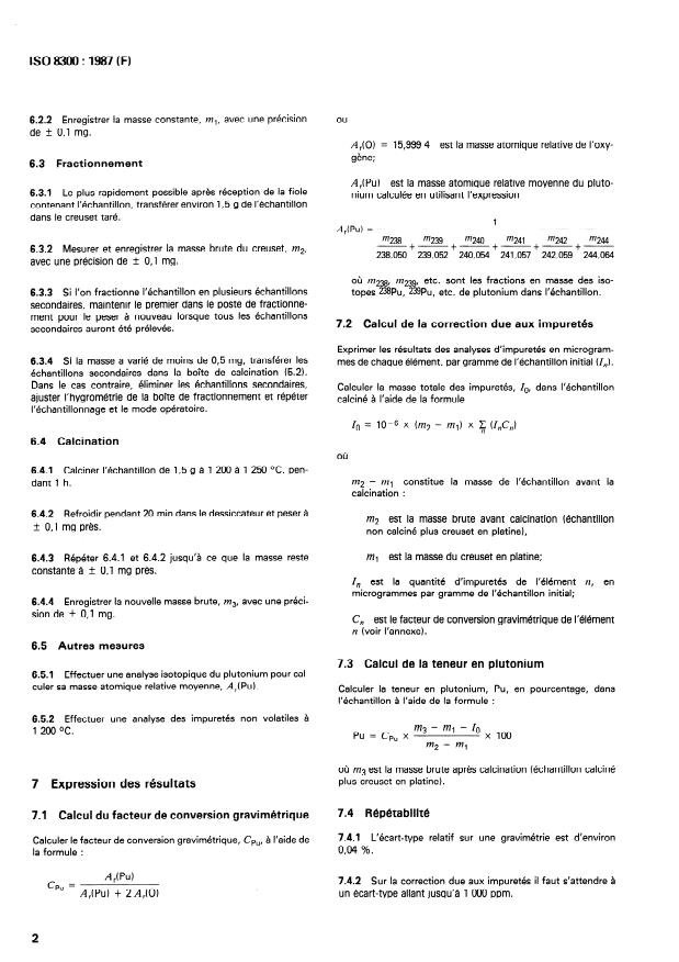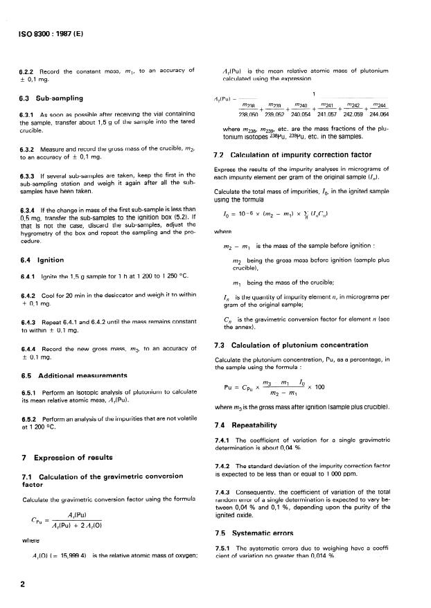 ISO 8300:1987 is a standard published by the International Organization for Standardization (ISO). Its full title is "Determination of plutonium content in plutonium dioxide (PuO2) of nuclear grade quality — Gravimetric method". This standard covers: The plutonium dioxide has to contain less than 0,5 % of non-volatile impurities. The content of these impurities shall be measured and a correction made to allow for them. The method is used to cross-check accountancy analyses of plutonium dioxide for safeguard purposes. Principle of the method, interferences, reagents, apparatus, procedure and expression of results are described.