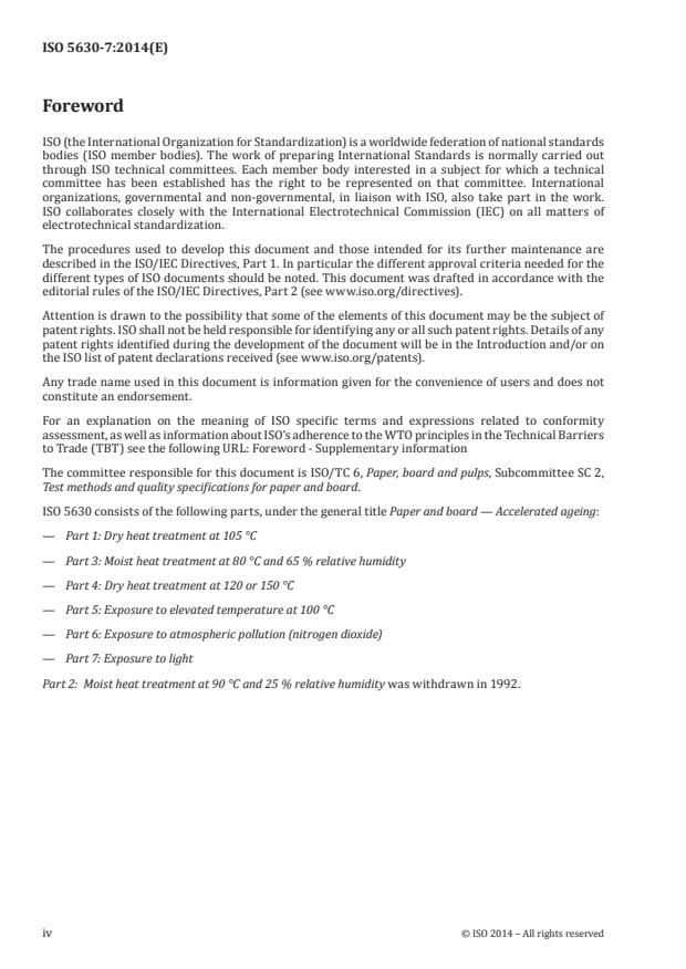 ISO 5630-7:2014 is a standard published by the International Organization for Standardization (ISO). Its full title is "Paper and board — Accelerated ageing — Part 7: Exposure to light". This standard covers: ISO 5630-7:2014 specifies a method for accelerating the ageing of paper and board through exposure to an elevated light irradiance and for assessing the effect of ageing on optical properties for the purpose of predicting stability to long-term natural ageing that occurs due to exposure to light. It is applicable to all types of paper and board whose surface is white or near white.