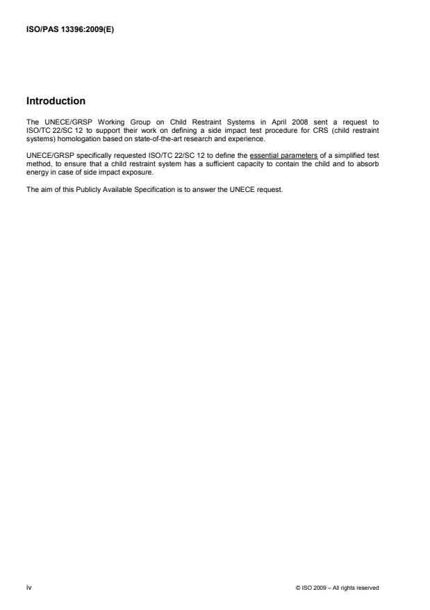 ISO/PAS 13396:2009 mainly summarises the content of ISO/TR 14646 to assist the Informal Group on CRS of UNECE/GRSP in their development of a simplified side impact method based on commonly agreed input data. In addition to the content of ISO/TR 14646, new data and further recommendations have been included. Where not otherwise stated, ISO/TR 14646 is reference source. The essential input parameters given in Clause 3 are applicable to accessory child restraint systems aiming to offer side impact protection.
