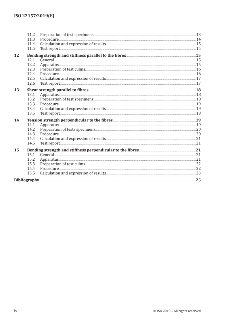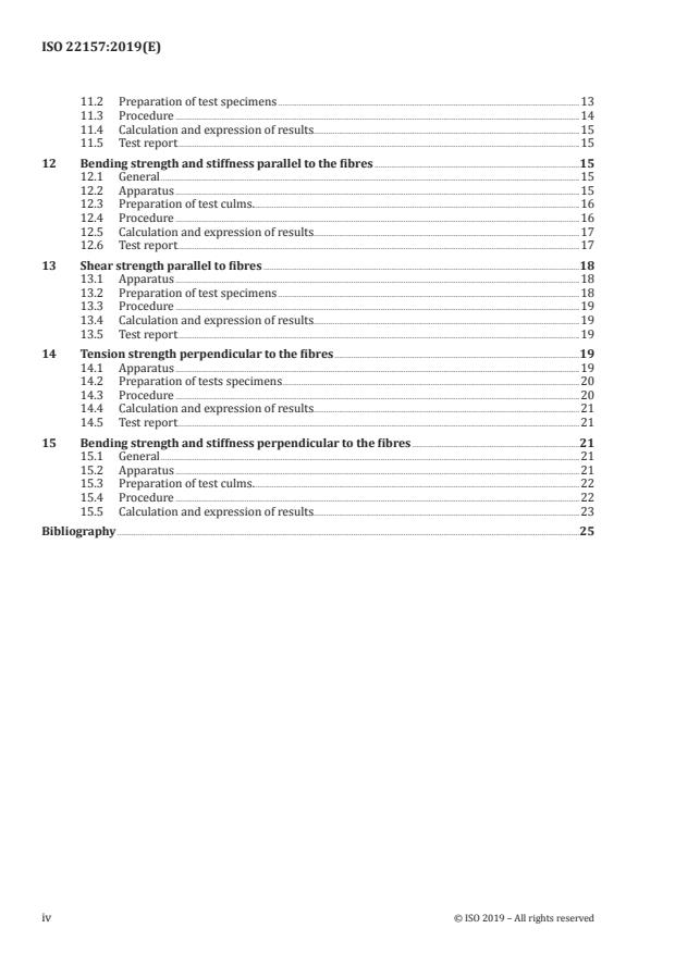 ISO 22157:2019 is a standard published by the International Organization for Standardization (ISO). Its full title is "Bamboo structures — Determination of physical and mechanical properties of bamboo culms — Test methods". This standard covers: This document specifies test procedures for specimens obtained from round bamboo culms. The data obtained from the test methods can be used to establish characteristic physical or mechanical properties to be used in structural engineering design or for other scientific purposes. This document provides methods for evaluating the following physical and strength properties: moisture content, density, mass per unit length; strength properties parallel to the fibre direction, compression, tension and bending, and strength properties perpendicular to the fibre direction, tension and bending. It also provides methods to estimate moduli of elasticity in bending, compression and tension parallel to fibres, and bending perpendicular to fibres. The test methods reported in this document are intended for commercial testing applications. The test methods reported in this document are intended for commercial testing applications and can also be adopted as benchmark methods for scientific research. This document is organized to provide requirements for standard tests to be carried out to determine the material properties of full-culm bamboo as a structural material.