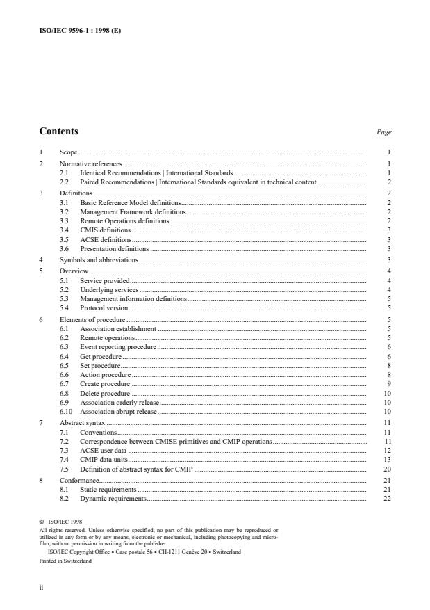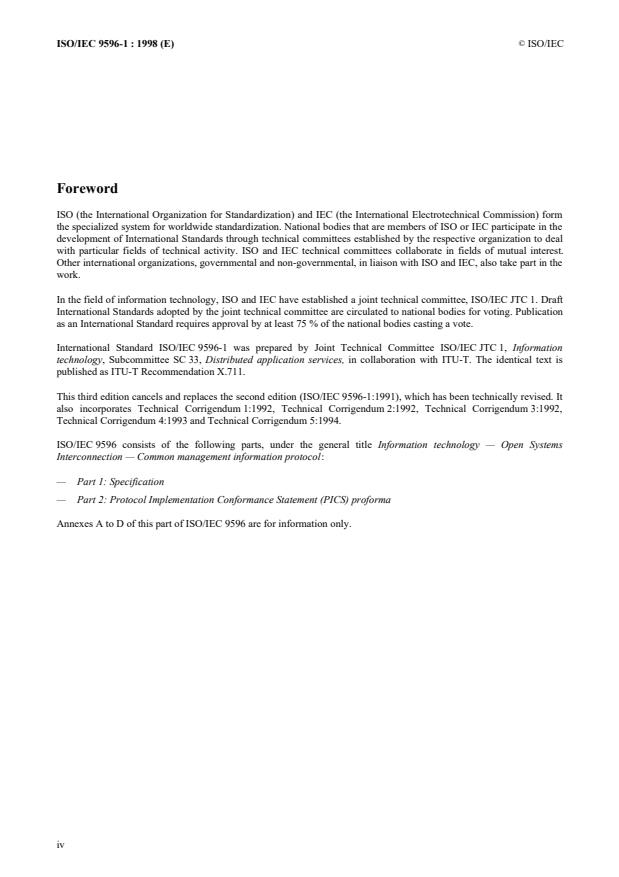 ISO/IEC 9596-1:1998 is a standard published by the International Organization for Standardization (ISO). Its full title is "Information technology - Open Systems Interconnection - Common management information protocol - Part 1: Specification". This standard covers: This Recommendation | International Standard specifies a protocol which is used by application layer entities to exchange management information. This Recommendation | International Standard specifies: ? procedures for the transmission of management information between application entities; ? the abstract syntax of the Common Management Information Protocol (CMIP) and the associated encoding rules to be applied; ? procedures for the correct interpretation of protocol control information; ? the conformance requirements to be met by implementation of this Recommendation | International Standard. This Recommendation | International Standard does not specify: ? the structure or meaning of the management information that is transmitted by means of CMIP; ? the manner in which management is accomplished as a result of CMIP exchanges; ? the interactions which result in the use of CMIP.