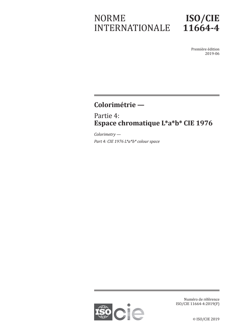 ISO/CIE 11664-4:2019 - Colorimétrie — Partie 4: Espace chromatique L*a*b* CIE 1976 Released:6/19/2019