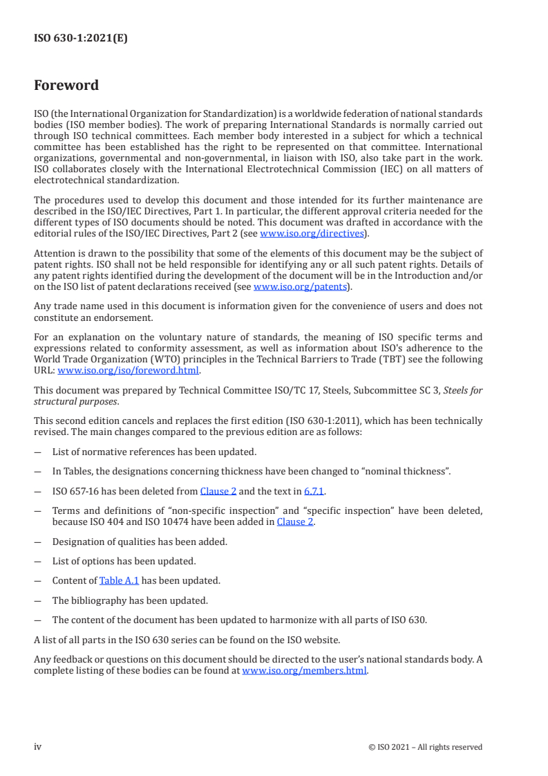 ISO 630-1:2021 is a standard published by the International Organization for Standardization (ISO). Its full title is "Structural steels — Part 1: General technical delivery conditions for hot-rolled products". This standard covers: This document specifies the general technical delivery conditions for steel flat and long products (plates/ sections/wide flats and bars) used principally for general-purpose structural steels. The steels specified in this document are intended for use in welded or bolted structures. The specific requirements for structural steels are given in the individual parts of ISO 630. This document does not include the following structural steels, some of which are covered by other International Standards: — sheet and strip: refer to ISO TC 17/SC 12 “Continuous mill flat rolled products”; — tubular products: refer to ISO TC 5/SC 1 “Steel tubes”. NOTE 1 Lists of standards covered by ISO/TC 17/SC 12 and ISO/TC 5/SC 1 are available on the ISO website. NOTE 2 In all parts of ISO 630, the term of "thickness" is considered as "nominal thickness", unless otherwise stated.