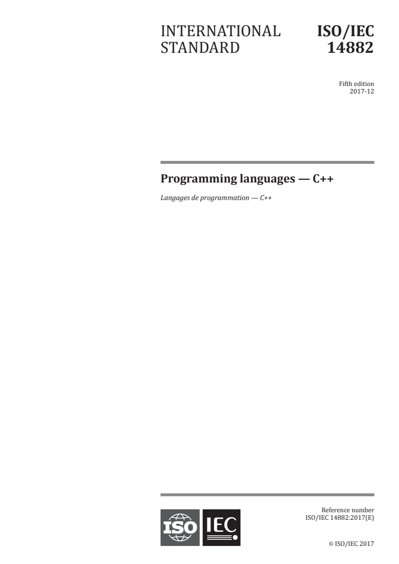 ISO/IEC 14882:2017 is a standard published by the International Organization for Standardization (ISO). Its full title is "Programming languages — C++". This standard covers: ISO/IEC 14882:2017 specifies requirements for implementations of the C++ programming language. The first such requirement is that they implement the language, so this document also defines C++. Other requirements and relaxations of the first requirement appear at various places within this document. C++ is a general purpose programming language based on the C programming language as described in ISO/IEC 9899:2011 Programming languages ? C (hereinafter referred to as the C standard). In addition to the facilities provided by C, C++ provides additional data types, classes, templates, exceptions, namespaces, operator overloading, function name overloading, references, free store management operators, and additional library facilities.