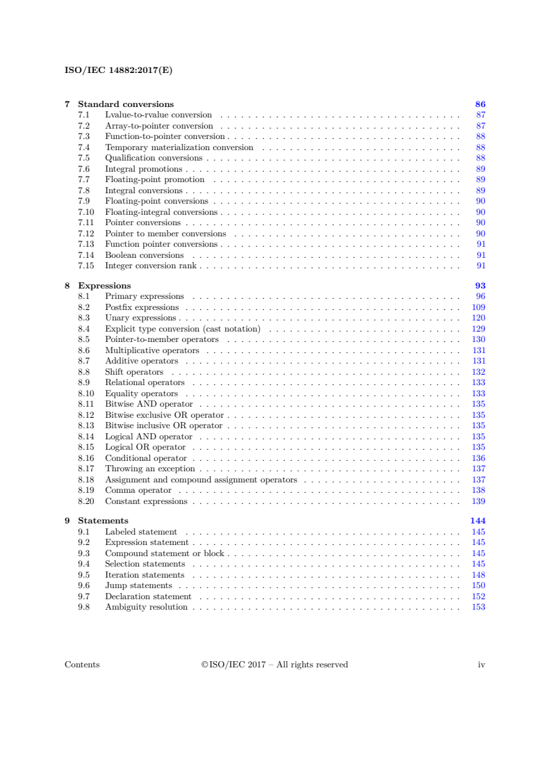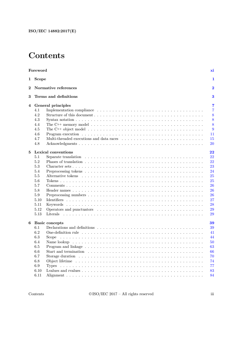 ISO/IEC 14882:2017 specifies requirements for implementations of the C++ programming language. The first such requirement is that they implement the language, so this document also defines C++. Other requirements and relaxations of the first requirement appear at various places within this document. C++ is a general purpose programming language based on the C programming language as described in ISO/IEC 9899:2011 Programming languages ? C (hereinafter referred to as the C standard). In addition to the facilities provided by C, C++ provides additional data types, classes, templates, exceptions, namespaces, operator overloading, function name overloading, references, free store management operators, and additional library facilities.