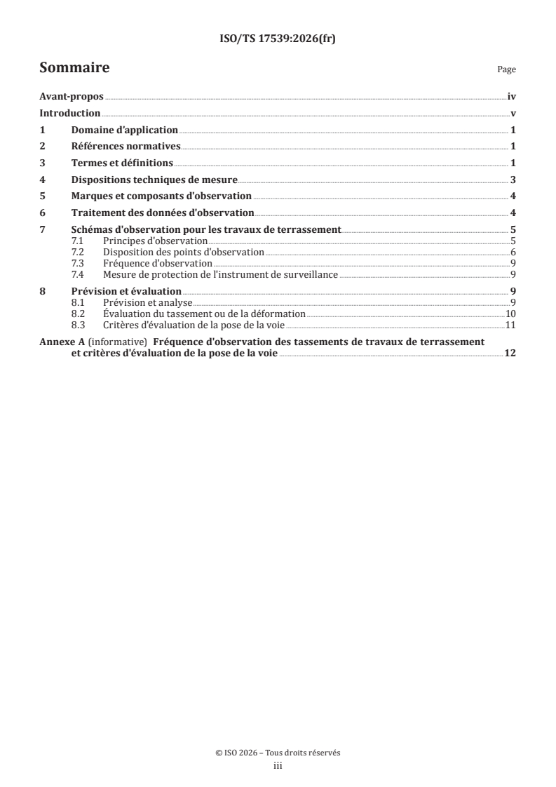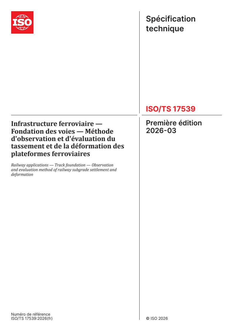 ISO/TS 17539:2026 - Infrastructure ferroviaire — Fondation des voies — Méthode d'observation et d'évaluation du tassement et de la déformation des plateformes ferroviaires