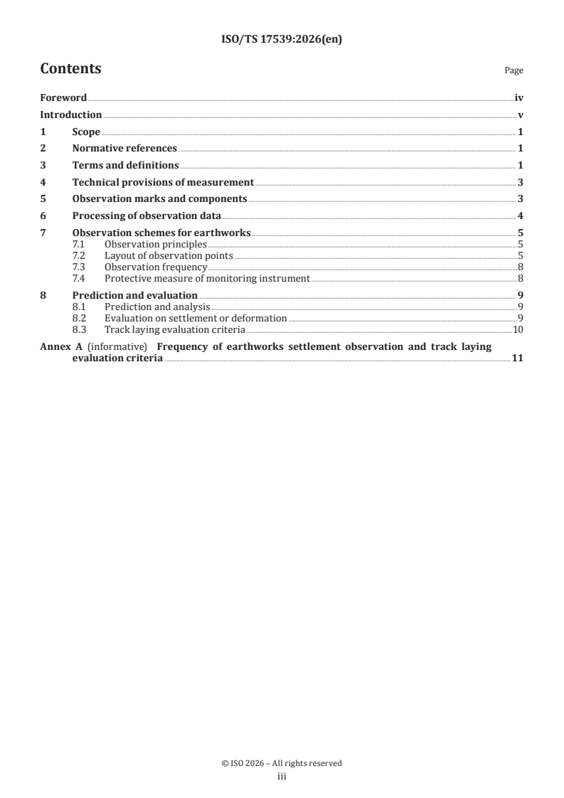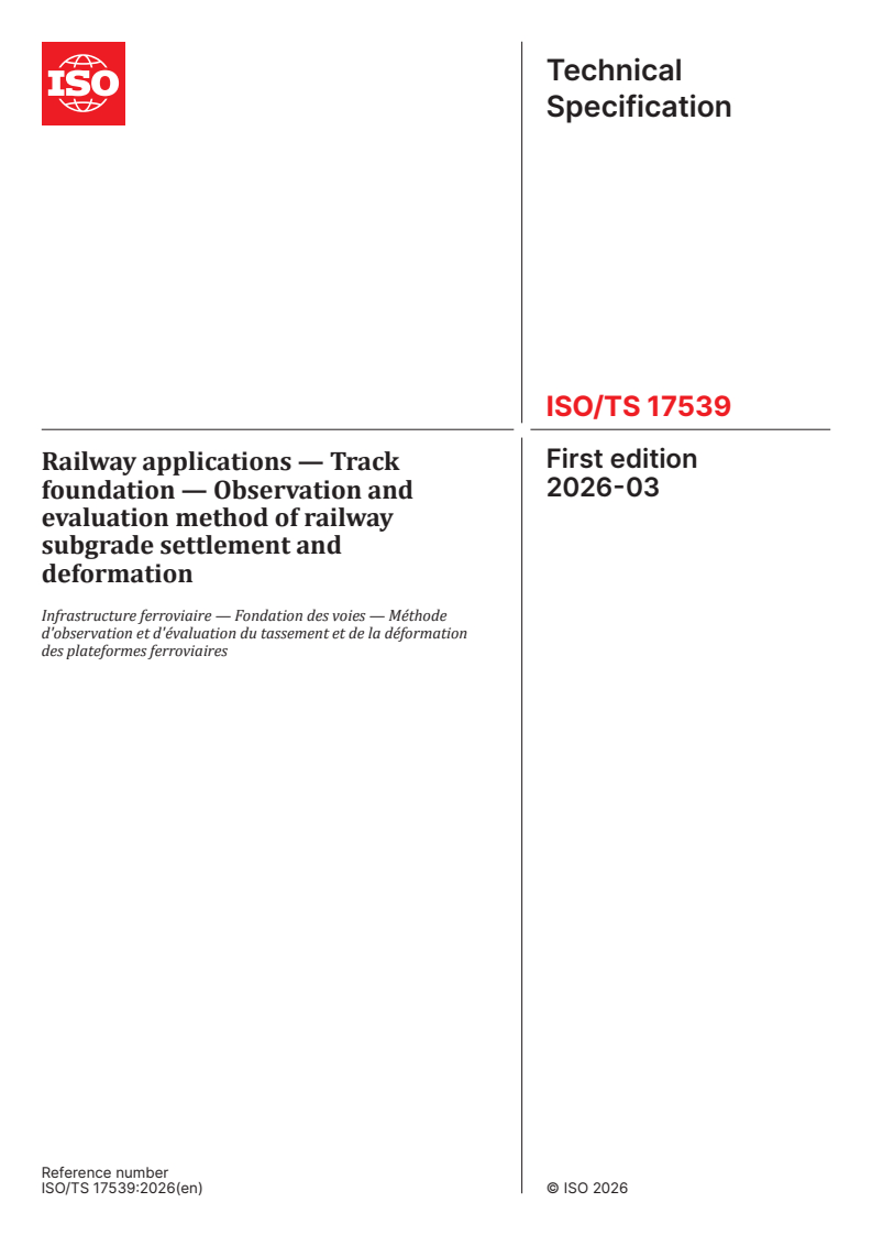 ISO/TS 17539:2026 is a technical specification published by the International Organization for Standardization (ISO). Its full title is "Railway applications — Track foundation — Observation and evaluation method of railway subgrade settlement and deformation". This standard covers: This document specifies the general requirements for the observation and evaluation method of railway earthworks (substructure and foundation ground) settlement and deformation for new-built and existing railway.