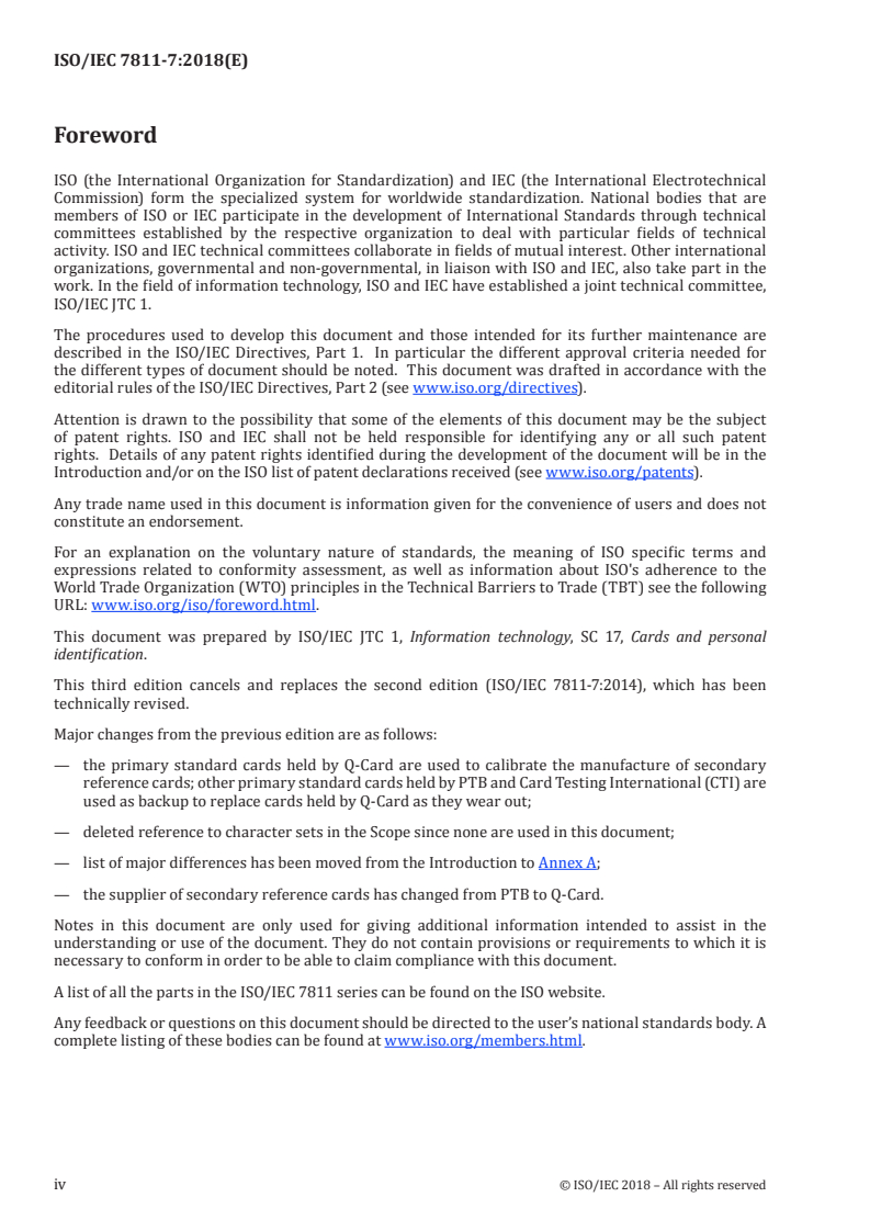 ISO/IEC 7811-7:2018 defines requirements for high coercivity, high density magnetic stripes on identification cards. Part of the ISO/IEC 7811 series, this standard specifies physical characteristics, encoding techniques and minimum performance criteria for magnetic stripes that offer improved resistance to erasure while maintaining read compatibility with existing magnetic-stripe formats. The standard targets a higher data capacity design (approximately 10× the capacity of ISO/IEC 7811-6) by increasing the number of tracks to six high-density tracks and using 8‑bit bytes with MFM (Modified Frequency Modulation) encoding.