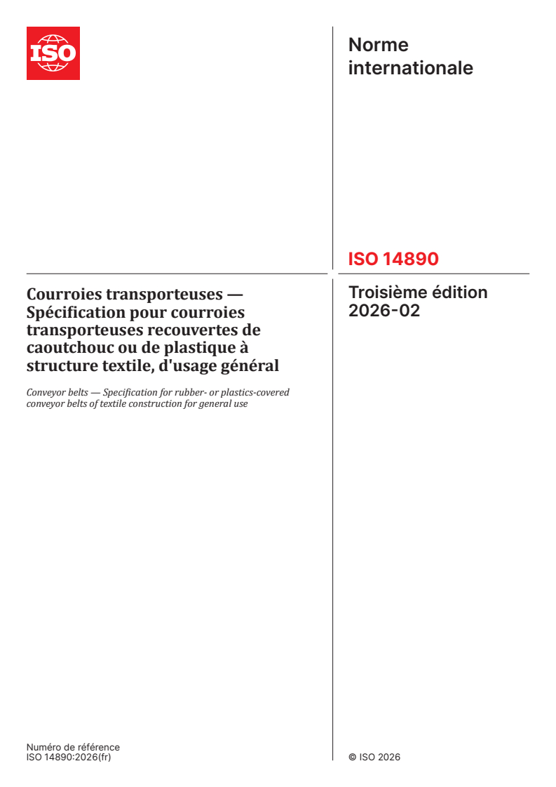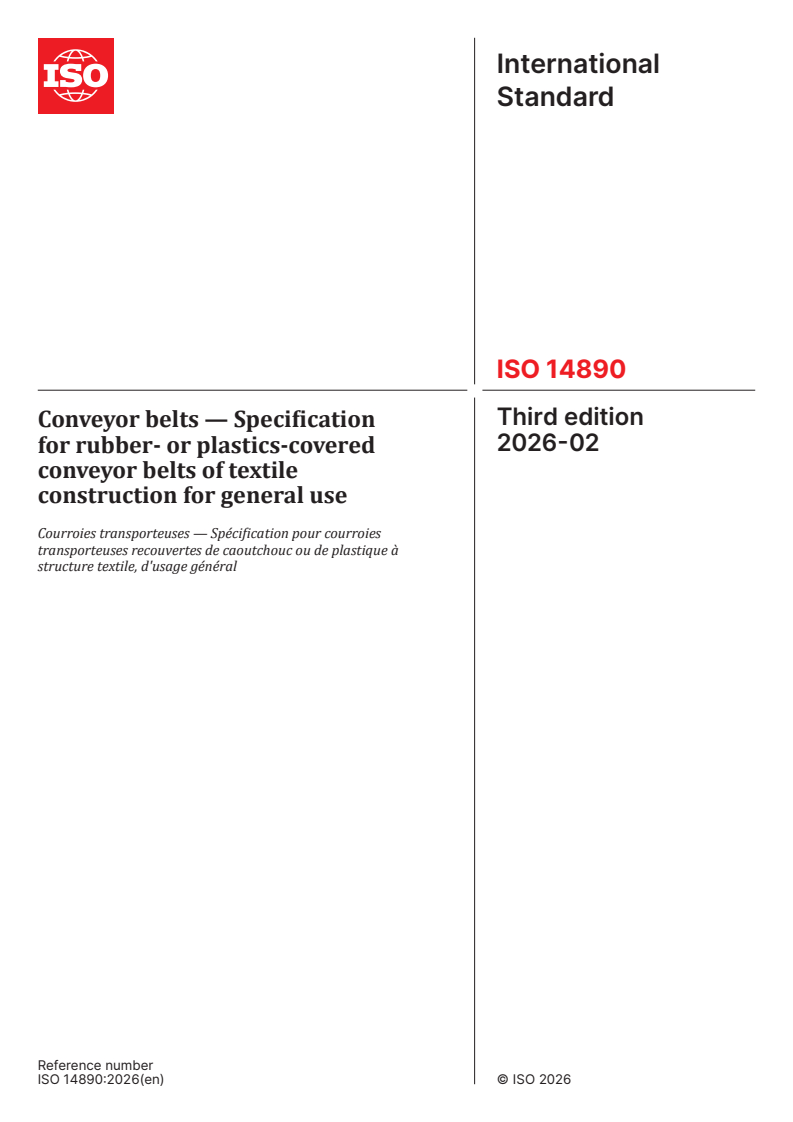 ISO 14890:2026 is a standard published by the International Organization for Standardization (ISO). Its full title is "Conveyor belts — Specification for rubber- or plastics-covered conveyor belts of textile construction for general use". This standard covers: This document specifies requirements for either rubber or plastics or both covered conveyor belting of textile construction for general surface use on flat or troughed idlers. This document is not applicable to light conveyor belts as described in ISO 21183-1.