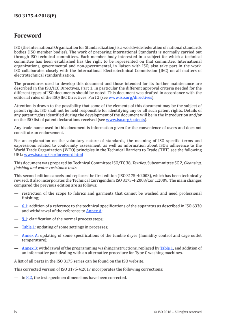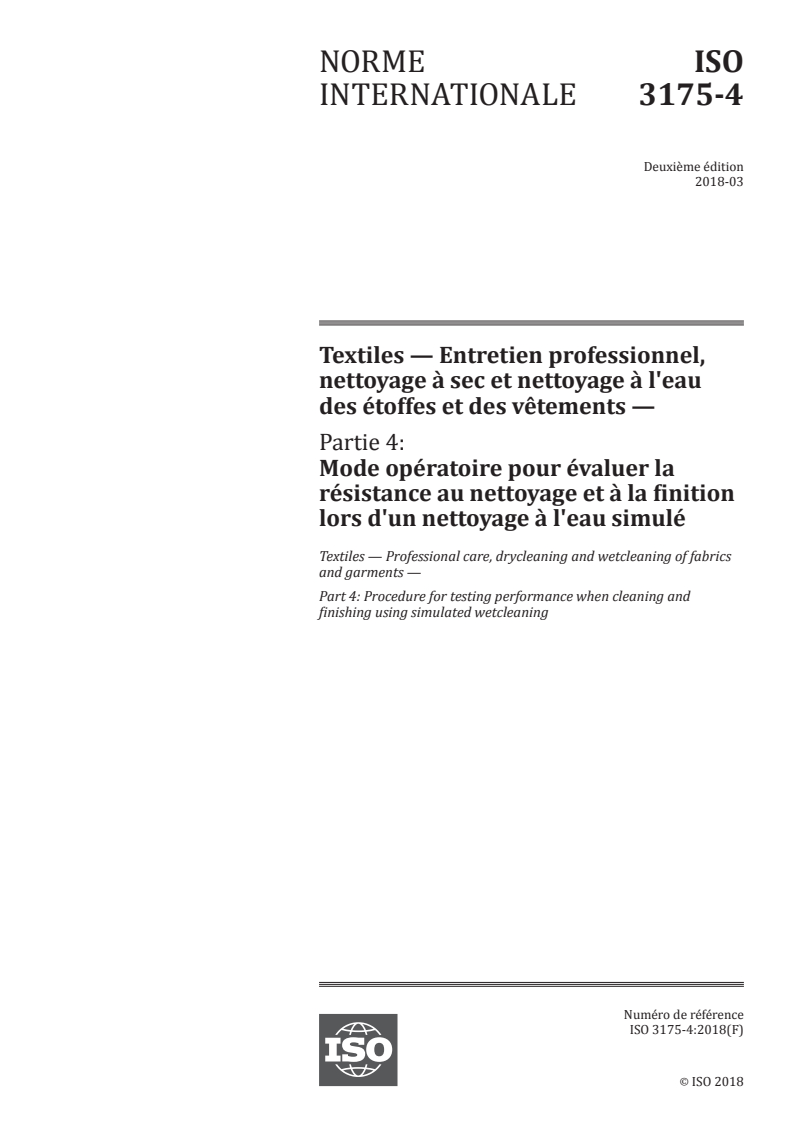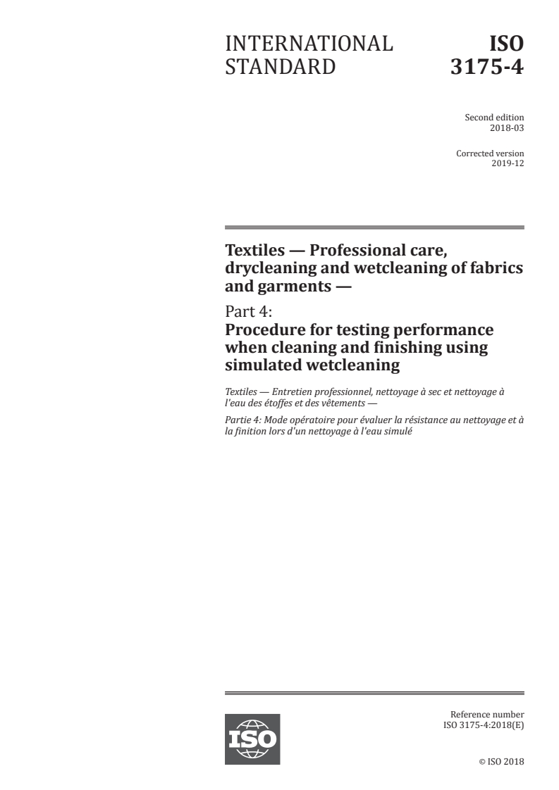 ISO 3175-4:2018 specifies simulated professional wetcleaning procedures, using a reference machine for fabrics and garments. It is intended for fabrics and garments that cannot be washed and need professional finishing. It comprises a normal process for normal materials, a mild process for sensitive materials and a very mild process for very sensitive materials. Localized staining and stain removal fall outside the scope of this document.