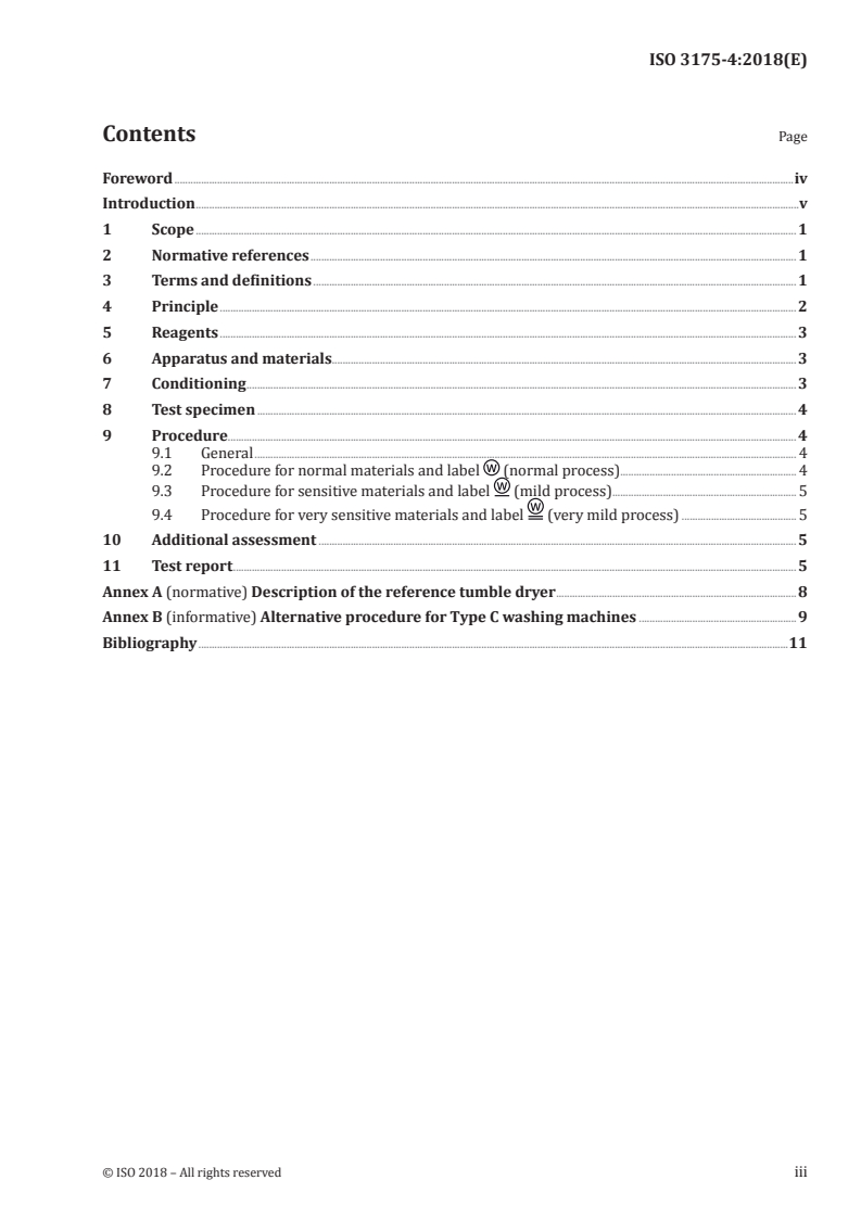 - Reference equipment: Uses a Type A1 reference washing machine (per ISO 6330) and a commercial tumble dryer with controlled air temperature; an alternative Type C procedure is described in Annex B.