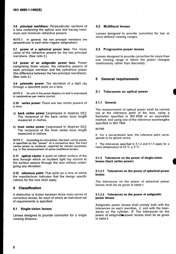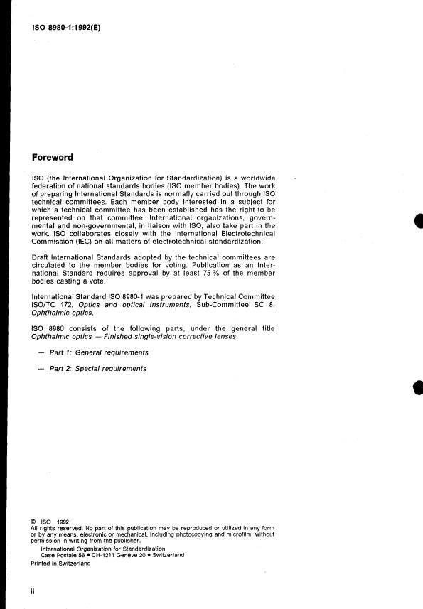 ISO 8980-1:1992 is a standard published by the International Organization for Standardization (ISO). Its full title is "Ophthalmic optics — Finished single-vision corrective lenses — Part 1: General requirements". This standard covers: Ophthalmic optics — Finished single-vision corrective lenses — Part 1: General requirements