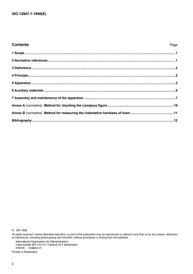 - Assembly, checks and maintenance: Procedures for verifying the Lissajous figure (Annex A), foam hardness (Annex B), parallelism between abrading table and specimen holder, and ease of running in bearings.