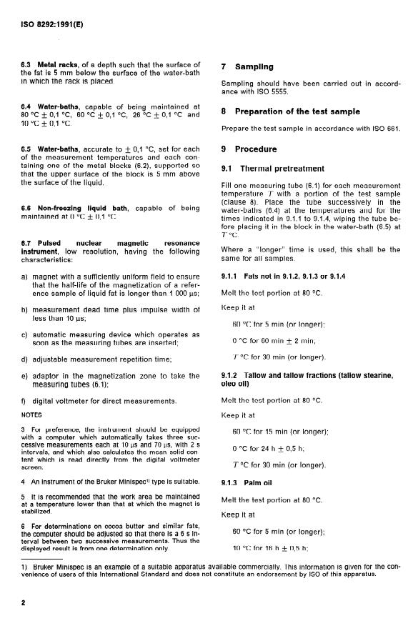 ISO 8292:1991 is a standard published by the International Organization for Standardization (ISO). Its full title is "Animal and vegetable fats and oils — Determination of solid fat content — Pulsed nuclear magnetic resonance method". This standard covers: Specifies a method for the determination of the solid fat content. Alternative thermal pretreatments are specified according to whether or not the fat exhibits pronounced polymorphism.