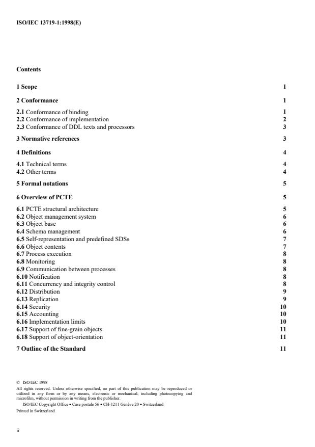 This part of ISO/IEC 13719 specifies PCTE in abstract, programming-language-independent, terms. It specifies the interface supported by any conforming implementation as a set of abstract operation specifications, together with the types of their parameters and results. It is supported by a number of standard bindings, i.e. representations of the interface in standard programming languages. The scope of this part of ISO/IEC 13719 is restricted to a single PCTE installation. It does not specify the means of communication between PCTE installations, nor between a PCTE installation and another system. A number of features are not completely defined in this part of ISO/IEC 13719, some freedom being allowed to the implementor. Some of these are implementation limits, for which constraints are defined (see clause 24). The other implementation-dependent and implementation-defined features are specified in the appropriate places in this Standard. PCTE is an interface to a set of facilities that forms the basis for constructing environments supporting systems engineering projects. These facilities are designed particularly to provide an infrastructure for programs which may be part of such environments. Such programs, which are used as aids to systems development, are often referred to as tools. This part of ISO/IEC 13719 also includes (in annex B) a language standard for the PCTE Data Description Language (DDL), suitable for writing PCTE schema definition sets.