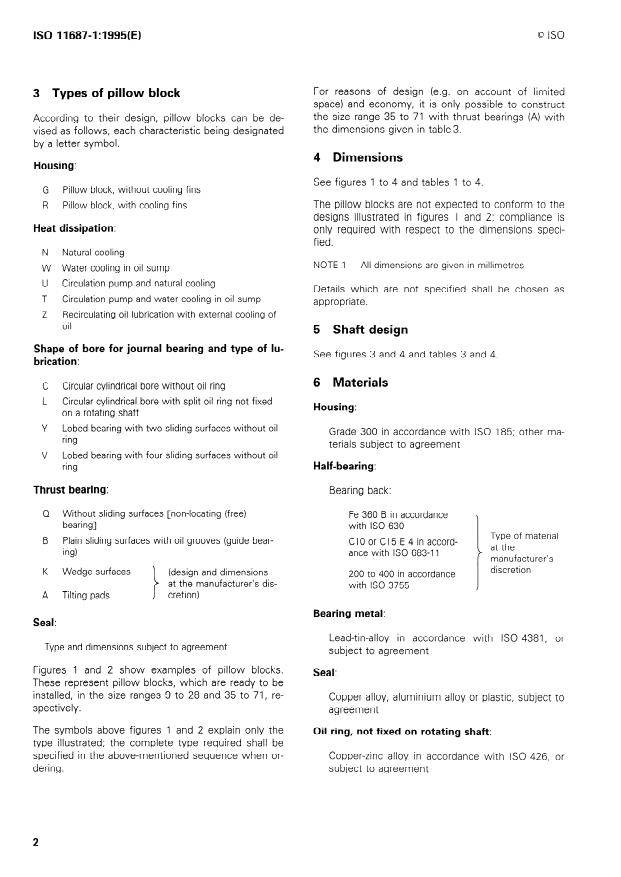 ISO 11687-1:1995 is a standard published by the International Organization for Standardization (ISO). Its full title is "Plain bearings — Pedestal plain bearings — Part 1: Pillow blocks". This standard covers: Specifies design characteristics (classification, dimensions, materials, designation) for pillow blocks for the size ranges 9 to 28 and 35 to 71, as well as design characteristics for shafts. Is applicable to pillow blocks used mainly in electrical and turbo engineering industries.
