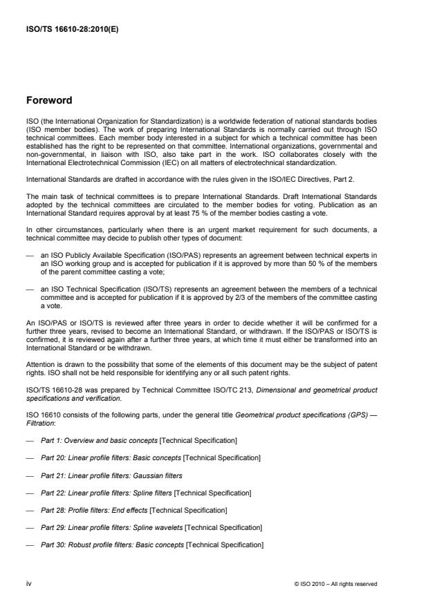 ISO/TS 16610-28:2010 is a technical specification published by the International Organization for Standardization (ISO). Its full title is "Geometrical product specifications (GPS) — Filtration — Part 28: Profile filters: End effects". This standard covers: ISO 16610-28:2010 provides methods for treating the end effects of linear profile filters where such effects occur.