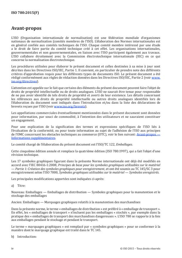 ISO 780:2015 spécifie un ensemble de symboles graphiques utilisés d'une manière conventionnelle pour le marquage des emballages de distribution au cours de leur chaîne de distribution physique afin de transmettre les instructions de manutention. Il convient d'utiliser les symboles graphiques seulement lorsqu'ils s'avèrent nécessaires. ISO 780:2015 est applicable à des emballages contenant des marchandises de tout genre, mais ne couvre pas les instructions de manutention spécifiques aux marchandises dangereuses.