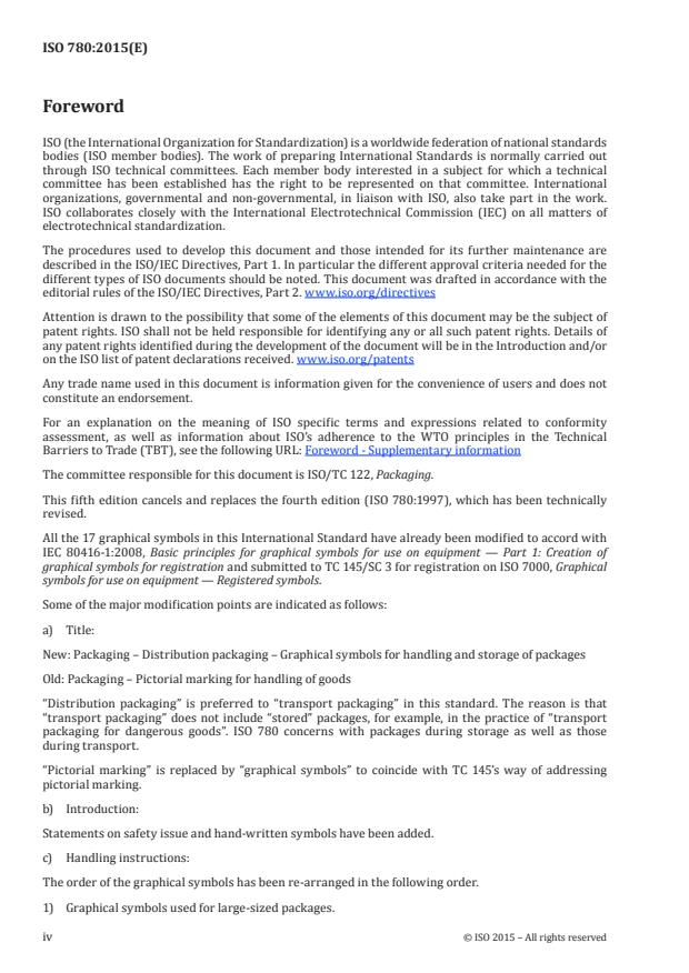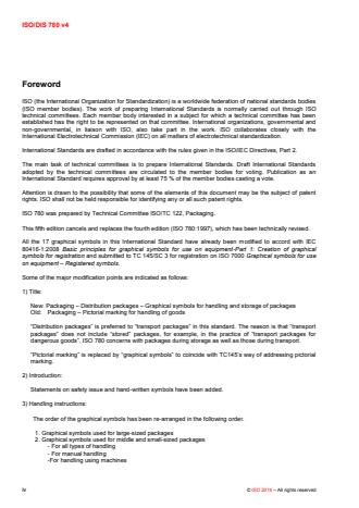ISO 780:2015 specifies a set of graphical symbols conventionally used for marking of distribution packages in their physical distribution chain to convey handling instructions. The graphical symbols should be used only when necessary. ISO 780:2015 is applicable to packages containing any kind of goods, but does not include instructions specific to handling of dangerous goods.