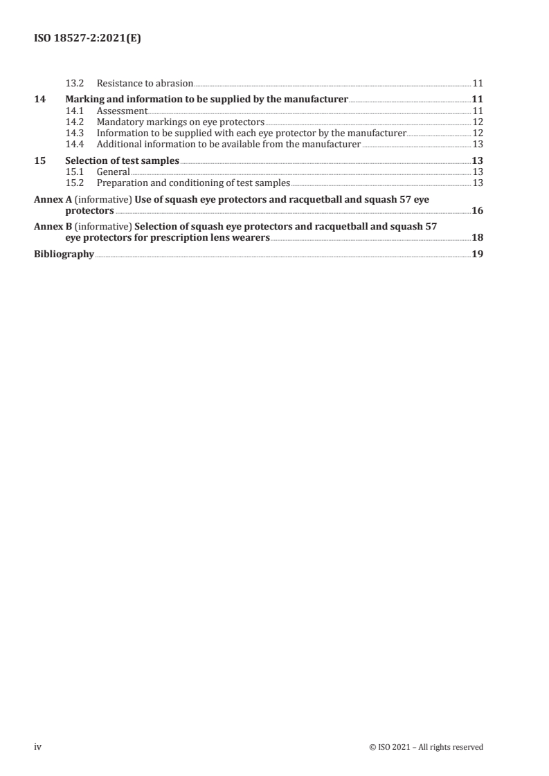 ISO 18527-2:2021 is a standard published by the International Organization for Standardization (ISO). Its full title is "Eye and face protection for sports use — Part 2: Requirements for eye protectors for squash and eye protectors for racquetball and squash 57". This standard covers: This document applies to all eye protectors intended for eye protection against hazards during playing or instructing in the sports of squash, racquetball and squash 57 and sports with similar hazards and no greater risks. It applies to eye protectors that incorporate prescription lenses but has no specific tests for eye protectors designed for use over spectacles. It specifies requirements and testing for materials, performance, marking of eye protectors and information to be supplied by the manufacturer. Information on the selection and use of eye protectors for squash, racquetball and squash 57 is given in Annex A. This document does not apply to a) sports eye protectors designed for use over prescription spectacles, b) eye protectors for other occupational applications, c) eye protectors without lenses, d) eye protectors for sports where the hazards are unrelated to the hazards in or involve greater risks than squash, racquetball and squash 57, and e) eye protectors with gradient-tinted lenses because they are not appropriate for squash, racquetball or squash 57.