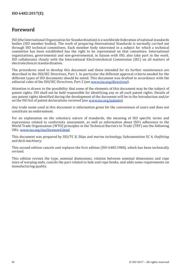 ISO 6482:2017 specifies standardized warping end profiles for shipboard deck machinery. It defines the types, nominal sizes, physical dimensions, markings and selection rules for warping ends used on windlasses, mooring winches, capstans and other deck machinery that handle steel wire rope and natural or man‑made fibre ropes. The standard replaces the 1980 edition and adds updated dimensional relations and manufacturing quality requirements.