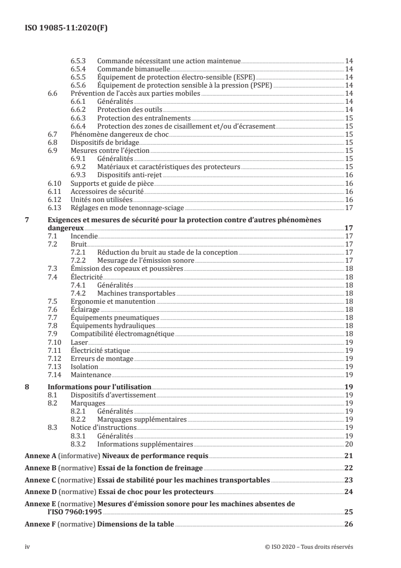 Le présent document donne les exigences et les mesures de sécurité pour les machines à bois combinées, fixes et transportables, comportant au moins deux unités de travail pouvant être utilisées séparément et à chargement et déchargement manuels de la pièce, ci-après désignées «machines». Les unités de travail intégrées peuvent être de ces types uniquement: — une unité de sciage; — une unité de toupillage; — une unité de dégauchissage. Les machines sont conçues pour la coupe de bois massif et de matériaux ayant des caractéristiques physiques similaires à celles du bois. NOTE 1 Pour les définitions de machines fixes et transportables, voir l'ISO 19085-1:2017, 3.4 et 3.5. Le présent document traite de tous les phénomènes dangereux, situations et événements dangereux significatifs, tels qu'énumérés à l'Article 4, applicables aux machines lorsqu'elles sont utilisées, réglées et entretenues comme prévu et dans les conditions prévues par le fabricant, incluant une mauvaise utilisation raisonnablement prévisible. Les phases de transport, d'assemblage, de démontage, de mise hors service et de mise au rebut ont également été prises en compte. NOTE 2 Pour les phénomènes dangereux pertinents mais non significatifs, par exemple, les arêtes vives du bâti de la machine, voir l'ISO 12100:2010. Le présent document s'applique aux machines également équipées des dispositifs/unités de travail supplémentaires énumérés dans les Domaines d'application des ISO 19085-5:2017, ISO 19085-6:2017, ISO 19085-7:2019 et ISO 19085-9:2019. Le présent document ne s'applique pas: a) aux machines comportant uniquement une unité de dégauchissage et un dispositif de mortaisage; NOTE 3 De telles machines sont traitées dans l'ISO 19085-7:2019. b) aux machines combinées comportant une scie à ruban; c) aux machines comportant une unité de mortaisage ayant un entraînement séparé autre que l'entraînement de l'unité de dégauchissage; d) aux machines prévues pour une utilisation en atmosphère explosible; e) aux machines fabriquées avant la date de sa publication comme Norme internationale.