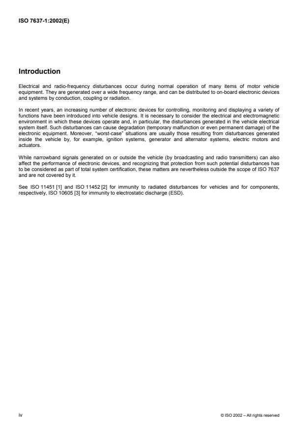 This part of ISO 7637 defines the basic terms relating to electrical disturbances from conduction and coupling used in its other parts, and gives general information on the whole of ISO 7637 and common to all parts.