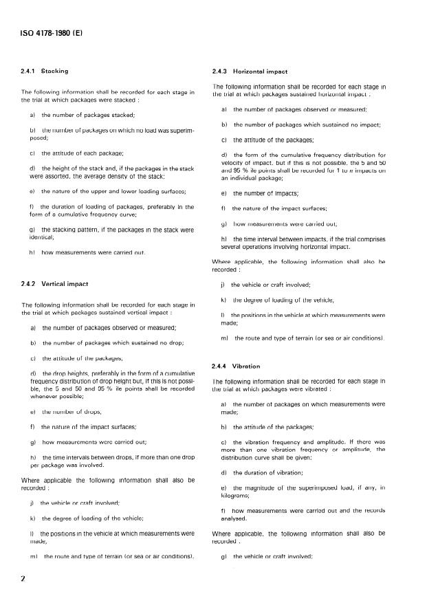 ISO 4178:1980 is a standard published by the International Organization for Standardization (ISO). Its full title is "Complete, filled transport packages - Distribution trials - Information to be recorded". This standard covers: This is applicable to distribution systems in which the hazards of stacking, vertical impact, horizontal impact, and vibration are encountered or are likely to be encountered. The following information shall be recorded in the order given: description of the trial, results of the trial, package, hazards in trial and general information.