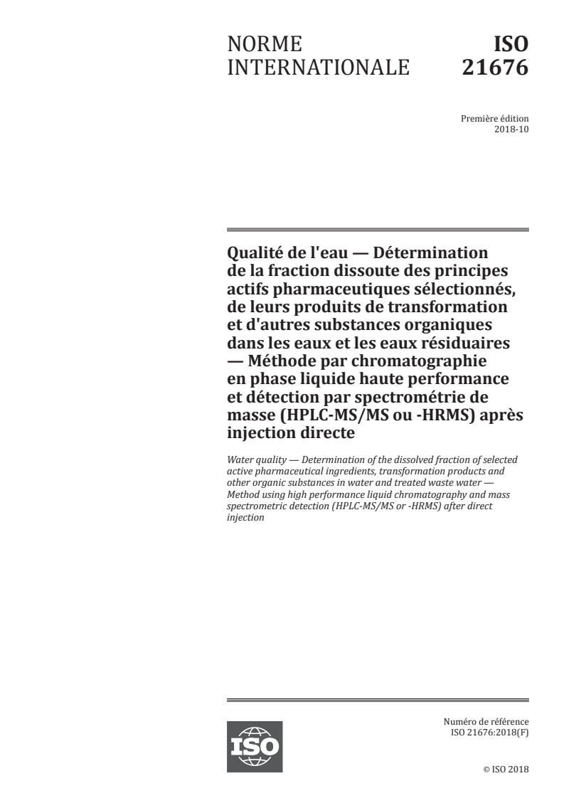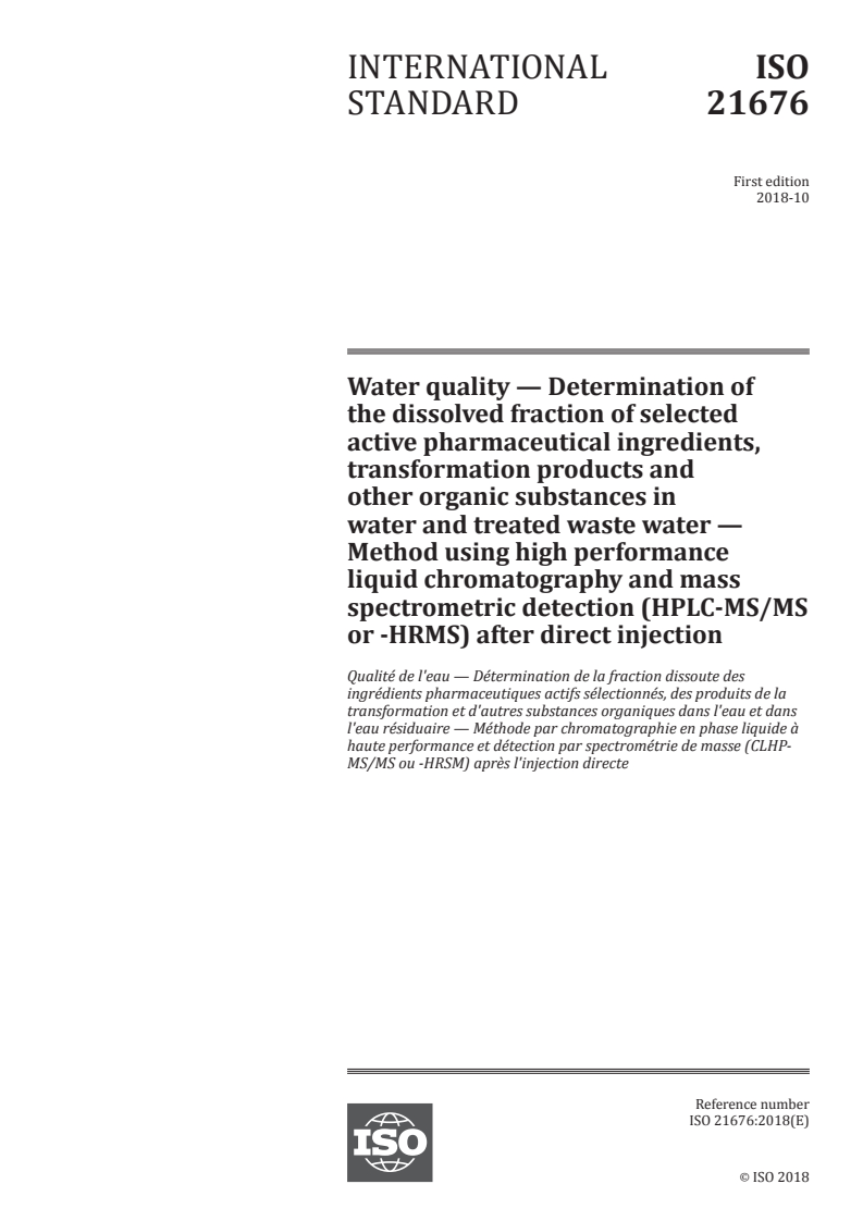 ISO 21676:2018 - Water quality — Determination of the dissolved fraction of selected active pharmaceutical ingredients, transformation products and other organic substances in water and treated waste water — Method using high performance liquid chromatography and mass spectrometric detection (HPLC-MS/MS or -HRMS) after direct injection Released:10/15/2018