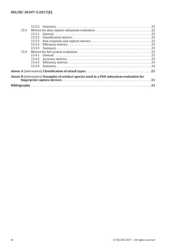 ISO/IEC 30107-3:2017 is a standard published by the International Organization for Standardization (ISO). Its full title is "Information technology — Biometric presentation attack detection — Part 3: Testing and reporting". This standard covers: ISO/IEC 30107-3:2017 establishes: - principles and methods for performance assessment of presentation attack detection mechanisms; - reporting of testing results from evaluations of presentation attack detection mechanisms; - a classification of known attack types (in an informative annex). Outside the scope are: - standardization of specific PAD mechanisms; - detailed information about countermeasures (i.e. anti-spoofing techniques), algorithms, or sensors; - overall system-level security or vulnerability assessment. The attacks considered in this document take place at the sensor during presentation. Any other attacks are considered outside the scope of this document.
