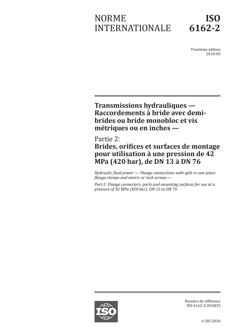 ISO 6162-2:2018 donne les spécifications générales et dimensionnelles des collets, des demi-brides (FCS et FCSM), des brides monobloc (FC et FCM), des orifices et des surfaces de montage utilisés pour les raccordements par demi-brides et brides monobloc à quatre vis sur tubes et flexibles de raccordement, pour utilisation à une une pression de fonctionnement de 42 MPa (420 bar[1]). Il spécifie également les dimensions des joints à utiliser, ainsi que celles des gorges recevant ces joints. ISO 6162-2:2018 tient compte également de la nécessité d'utiliser des fixations métriques (type 1) (pour DN 13 à DN 76), tout en fournissant un moyen d'utiliser les fixations existantes en inches (type 2) (pour DN 13 à DN 51). Ces raccordements sont destinés à être utilisés dans les systèmes de transmission hydraulique sur des produits industriels et commerciaux lorsque qu'il est souhaitable d'éviter l'utilisation de raccordements filetés. [1] 1 bar = 0,1 MPa = 105 Pa ; 1 Pa = 1 N/m2