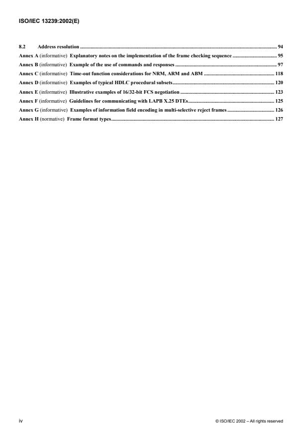 This International Standard specifies the frame structures, the elements of procedures, the classes of procedures, the content and format of the general purpose Exchange Identification (XID) frame, and a means for resolution/negotiation of a data link layer address in switched environments for data communication systems using bit-oriented high-level data link control (HDLC) procedures. NOTE The use of the phrase "bit-oriented", referring to the HDLC control procedures, pertains to the allocation of a non-integral number of bits to various subfields used for HDLC control purposes. However, the frame as an entirety may be constructed from octet-oriented units (e.g., start-stop mode) for transmission purposes. The frame structure portion defines the relative positions of the various components of the basic frame format and the nonbasic frame format. The mechanisms used to achieve bit pattern independence (transparency), where and when required, within the frame are also defined. In addition, three frame checking sequences (FCS) are specified; the rules for address field extension are defined; and the addressing conventions available are described. The elements of procedures portion specifies elements of data link control procedures for synchronous or start/stop, codetransparent data transmission using independent frame numbering in both directions. These HDLC elements of procedures are defined specifically in terms of the actions that occur on receipt of commands at a secondary station, a tributary station, a peer station, or a combined station. This International Standard is intended to cover a wide range of applications; for example one-way, two-way alternate or twoway simultaneous data communication between data stations which are usually buffered, including operations on different types of data circuits; for example multipoint/point-to-point, duplex/half-duplex, switched/non-switched, synchronous/startstop, etc. The defined elements of procedures are to be considered as a common basis for establishing different types of data link control procedures. This International Standard does not define any single system and should not be regarded as a specification for a data communication system. Not all of the commands or responses are required for any particular system implementation. The classes of procedures portion describes the HDLC unbalanced classes of procedures, the HDLC balanced class of procedures, and the HDLC connectionless classes of procedures for synchronous or start/stop data transmission. For the unbalanced classes, the data link consists of a primary station plus one or more secondary stations and operates in either the normal response mode or the asynchronous response mode in a point-to-point or multipoint configuration. For the balanced class, the data link consists of two combined stations and operates in the asynchronous balanced mode in a point-topoint configuration. For the unbalanced connectionless class, the data link consists of a control station plus one or more tributary stations and operates in the unbalanced connectionless-mode in a point-to-point or multipoint configuration. For the balanced connectionless class, the data link consists of two peer stations and operates in the balanced connectionless-mode in a point-to-point configuration. In each class, a basic repertoire of commands and responses is defined, but the capability of the data link may be modified by the use of optional functions. Balanced operation is intended for use in circumstances which require equal control at either end of the data link. Operational requirements are covered in accordance with the overall HDLC architecture. The content and format of the Exchange Identification (XID) frame portion builds on the fact that the principal use of the XID frame is to exchange data link information between two or more HDLC stations. For the purpose of this International Standard, ISO/IEC 13239:2002(E)