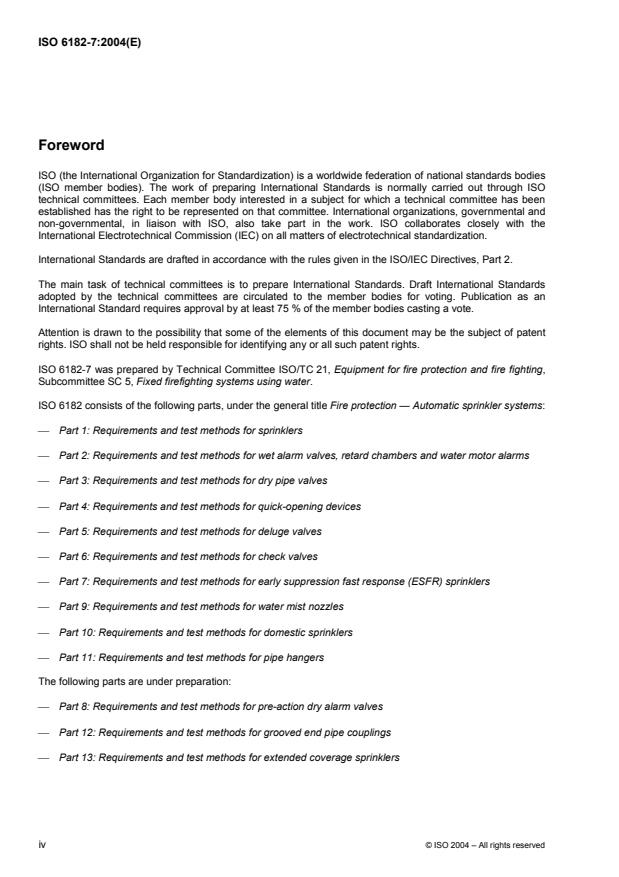 ISO 6182-7:2004 specifies performance requirements, test methods and marking requirements for fusible element and glass-bulb early suppression fast response (ESFR) sprinklers. It is applicable to ESFR sprinklers with flow constants of 202 ± 8.