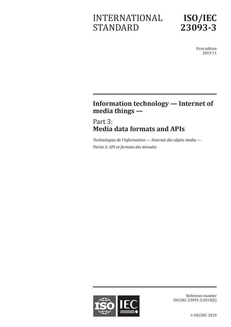 ISO/IEC 23093-3:2019 - Information technology — Internet of media things — Part 3: Media data formats and APIs Released:11/25/2019