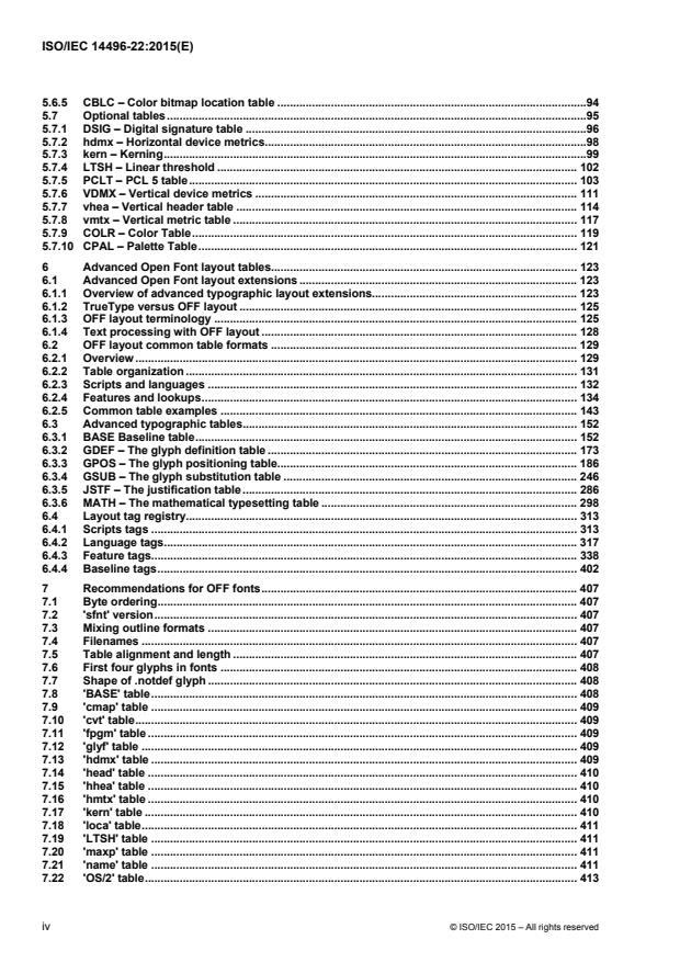 ISO/IEC 14496-22:2015 is a standard published by the International Organization for Standardization (ISO). Its full title is "Information technology — Coding of audio-visual objects — Part 22: Open Font Format". This standard covers: ISO/IEC 14496-22:2015 specifies the Open Font Format (OFF) specification, the TrueType? and Compact Font Format (CFF) outline formats, and the TrueType hinting language. Many references to both TrueType and PostScript exist throughout this document, as Open Font Format fonts combine the two technologies.