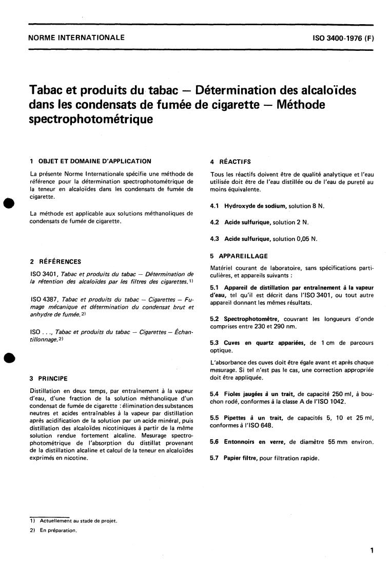 ISO 3400:1976 is a standard published by the International Organization for Standardization (ISO). Its full title is "Tobacco and tobacco products — Determination of alkaloids in cigarette smoke condensates — Spectrophotometric method". This standard covers: Tobacco and tobacco products — Determination of alkaloids in cigarette smoke condensates — Spectrophotometric method