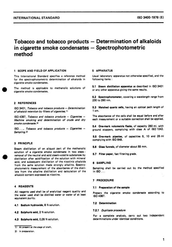 ISO 3400:1976 - Tobacco and tobacco products — Determination of alkaloids in cigarette smoke condensates — Spectrophotometric method Released:10/1/1976