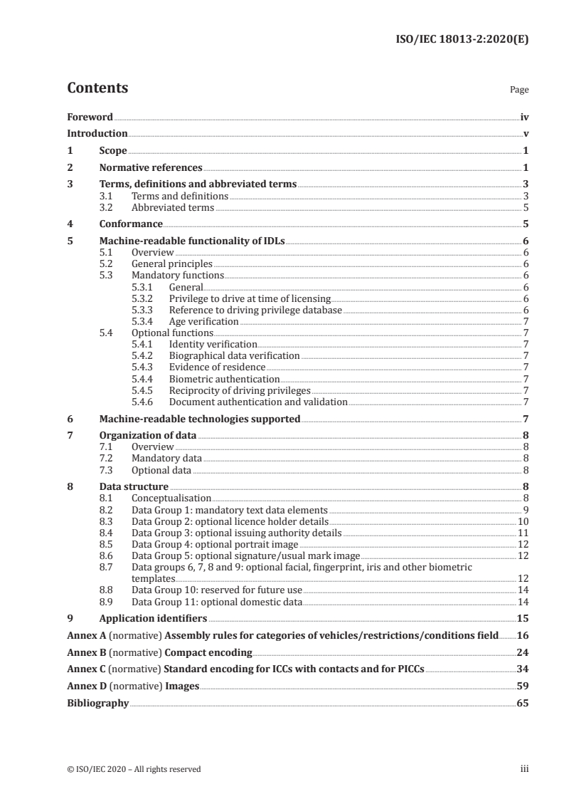 ISO/IEC 18013-2:2020 defines the machine‑readable technologies and data model for an ISO‑compliant driving licence (IDL). The standard specifies which data elements are mandatory or optional, the logical data structure (data groups), and encoding rules for currently supported card technologies. Its goals are to increase productivity, enable reliable electronic data exchange, and assist authenticity and integrity validation of driving licences while protecting holder privacy through basic access protection for contactless integrated circuits.