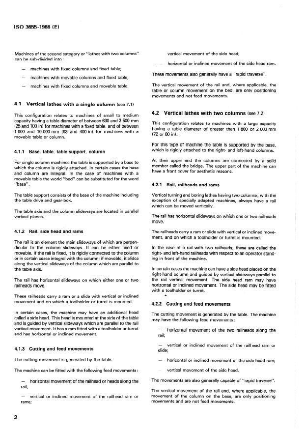 ISO 3655:1986 is a standard published by the International Organization for Standardization (ISO). Its full title is "Acceptance conditions for vertical turning and boring lathes with one or two columns and a single fixed or movable table - General introduction and testing of the accuracy". This standard covers: Defines the machining processes that can be carried out on these turning and boring lathes. Describes the different types of machines. Gives the nomenclature for these machines in English, French and Russian as well as in German, Italian and Swedish. ISO 3655 specifies both geometrical and practical tests on these general purpose and normal accuracy machines, and gives the corresponding permissible deviations which apply. It deals only with the verification of the accuracy of the machine. Does not apply to the testing of the running of the machine, or to characteristics.
