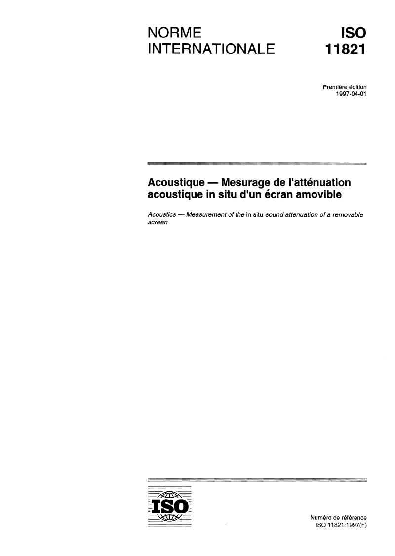 ISO 11821:1997 - Acoustique — Mesurage de l'atténuation acoustique in situ d'un écran amovible Released:3/27/1997