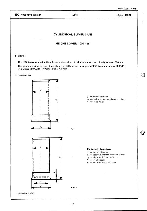 This IS0 Recommendation futes the main dimensions of cylindrical sliver cans of heights over 1000 mm.