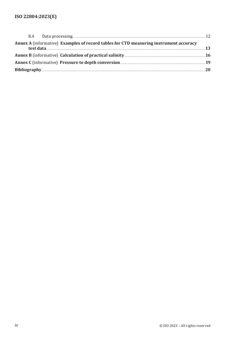 ISO 22804:2023 is a standard published by the International Organization for Standardization (ISO). Its full title is "Marine technology - General technical requirement of marine conductivity-temperature-depth (CTD) measuring instrument". This standard covers: This document specifies the technical requirements to ensure consistent reporting on the test method, inspection rules, marks, packaging, transportation and storage of conductivity-temperature-depth (CTD) profilers. This document is applicable to marine fixed-point and mobile observation, monitoring platform and the various types of shipborne CTD measuring instruments. NOTE A CTD directly measures conductivity, temperature, pressure of seawater. Depth is the conversion of pressure according to the Formula (C.1).