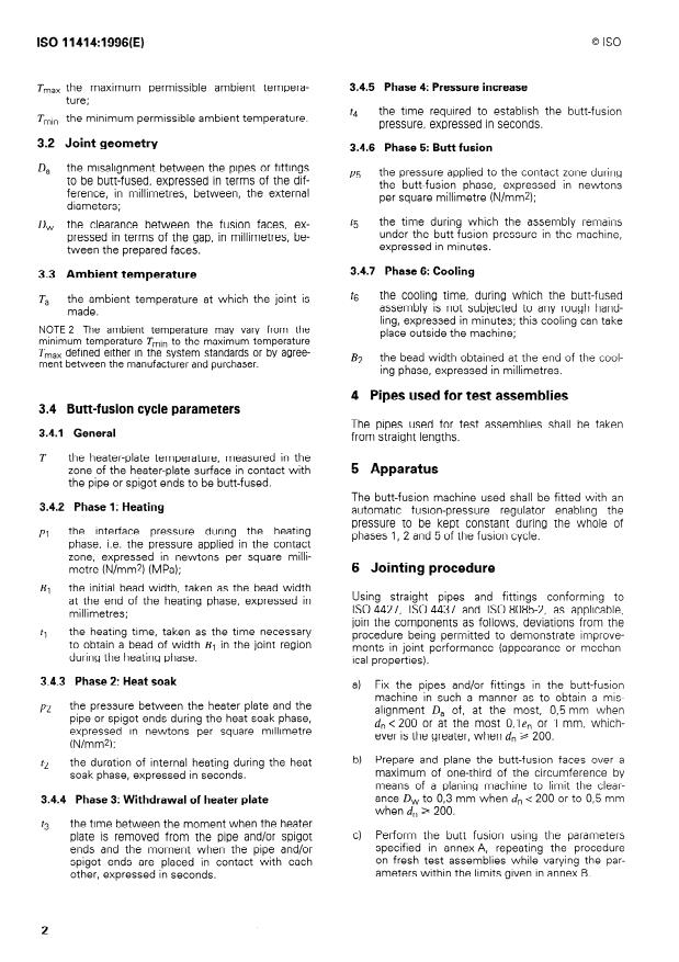 ISO 11414:1996 is a standard published by the International Organization for Standardization (ISO). Its full title is "Plastics pipes and fittings — Preparation of polyethylene (PE) pipe/pipe or pipe/fitting test piece assemblies by butt fusion". This standard covers: Describes a procedure for preparing butt-fusion-jointed test piece assemblies between polyethylene (PE) pipes and spigot-ended fittings. Specifies the assembly parameters such as ambient temperature, joint geometry and fusion parameters.
