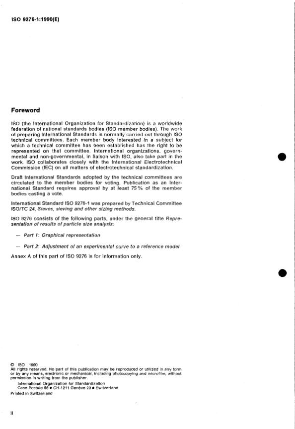 ISO 9276-1:1990 is a standard published by the International Organization for Standardization (ISO). Its full title is "Representation of results of particle size analysis — Part 1: Graphical representation". This standard covers: Representation of results of particle size analysis — Part 1: Graphical representation
