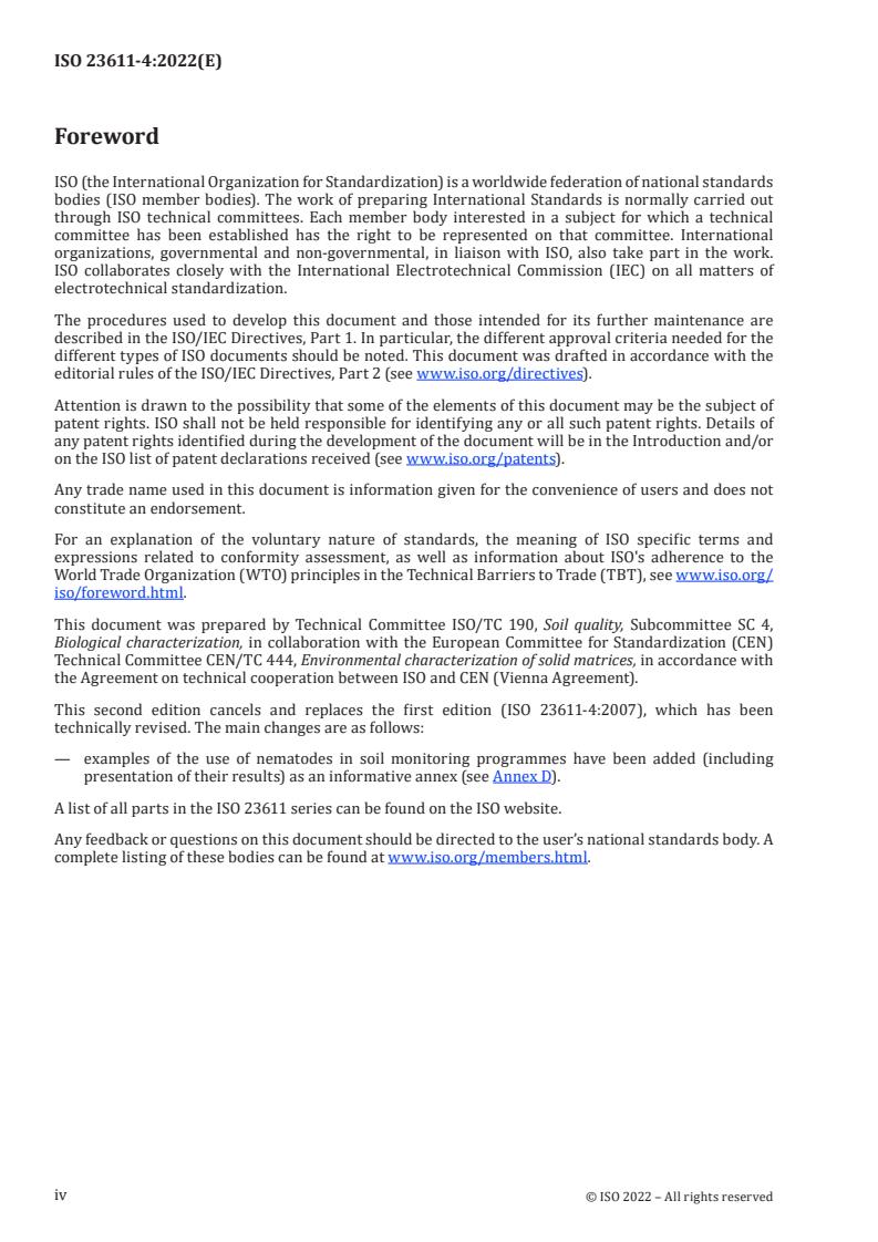 ISO 23611-4:2022 is a standard published by the International Organization for Standardization (ISO). Its full title is "Soil quality - Sampling of soil invertebrates - Part 4: Sampling, extraction and identification of soil-inhabiting nematodes". This standard covers: This document specifies a method for sampling and handling free-living nematodes from terrestrial field soils as a prerequisite for using them as bio-indicators (e.g. to assess the quality of a soil as a habitat for organisms). This document applies to all terrestrial biotopes in which nematodes occur. The sampling design of field studies in general is specified in ISO 18400-101. This document is not applicable to aquatic nematodes because of differences in the sample matrix (e.g. water column). Methods for some other soil organism groups such as earthworms, collembolans enchytraeids or macro-invertebrates are covered in ISO 23611-1, ISO 23611-2, ISO 23611-3 and ISO 23611-5. This document does not cover the pedological characterization of the site which is highly recommendable when sampling soil invertebrates. ISO 10390, ISO 10694, ISO 11272, ISO 11274, ISO 11277, ISO 11461 and ISO 11465 include suitable procedures for measuring pH, particle size distribution, C/N ratio, organic carbon content and water-holding capacity.