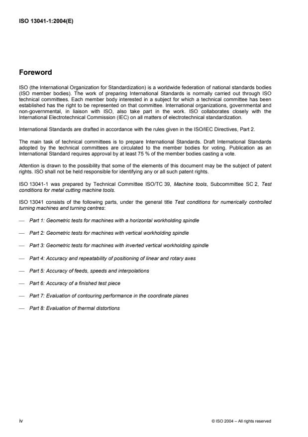 ISO 13041-1:2004 is a standard published by the International Organization for Standardization (ISO). Its full title is "Test conditions for numerically controlled turning machines and turning centres — Part 1: Geometric tests for machines with a horizontal workholding spindle". This standard covers: ISO 13041-1:2004 specifies, with reference to ISO 230-1:1996, the geometric tests on numerically controlled (NC) turning machines and turning centres, of normal accuracy, with horizontal work spindle(s). ISO 13041-1:2004 specifies the applicable tolerances corresponding to the tests mentioned above. ISO 13041-1:2004 explains different concepts or configurations and common features of NC turning machines and turning centres. It also provides a terminology and designation of controlled axes. ISO 13041-1:2004 deals only with the verification of the accuracy of the machine. It does not apply to the operational testing of the machine (e.g. vibration, abnormal noise, stick-slip motion of components), nor to machine characteristics (e.g. speeds, feeds) as such checks are generally carried out before testing the accuracy.