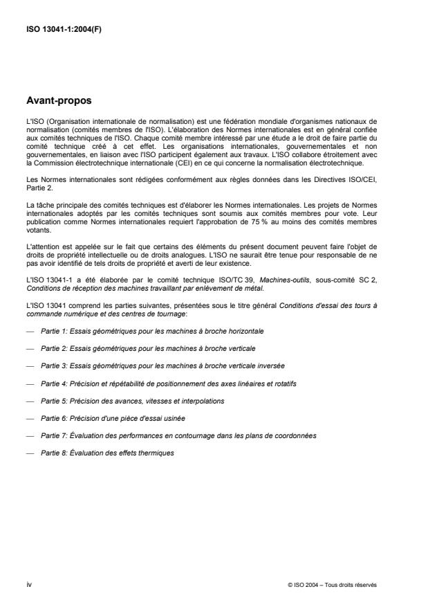 L'ISO 13041-1:2004 spécifie, en faisant référence à l'ISO 230-1:1996, les essais géométriques relatifs aux tours à commande numérique et aux centres de tournage, de précision normale, à broche(s) horizontale(s). L'ISO 13041-1:2004 spécifie les tolérances applicables correspondant aux essais mentionnés ci-dessus. L'ISO 13041-1:2004 précise différents concepts ou configurations ainsi que les caractéristiques communes des tours à commande numérique et des centres de tournage. Elle fournit également une terminologie et une désignation des axes commandés. L'ISO 13041-1:2004 traite uniquement de la vérification de la précision de la machine. Elle ne traite ni de l'examen du fonctionnement de la machine (par exemple vibrations, bruit anormal, broutage dans les déplacements d'organes) ni de celui des caractéristiques de cette dernière (par exemple vitesses, avances), dans la mesure où ces examens précèdent généralement celui de la précision.
