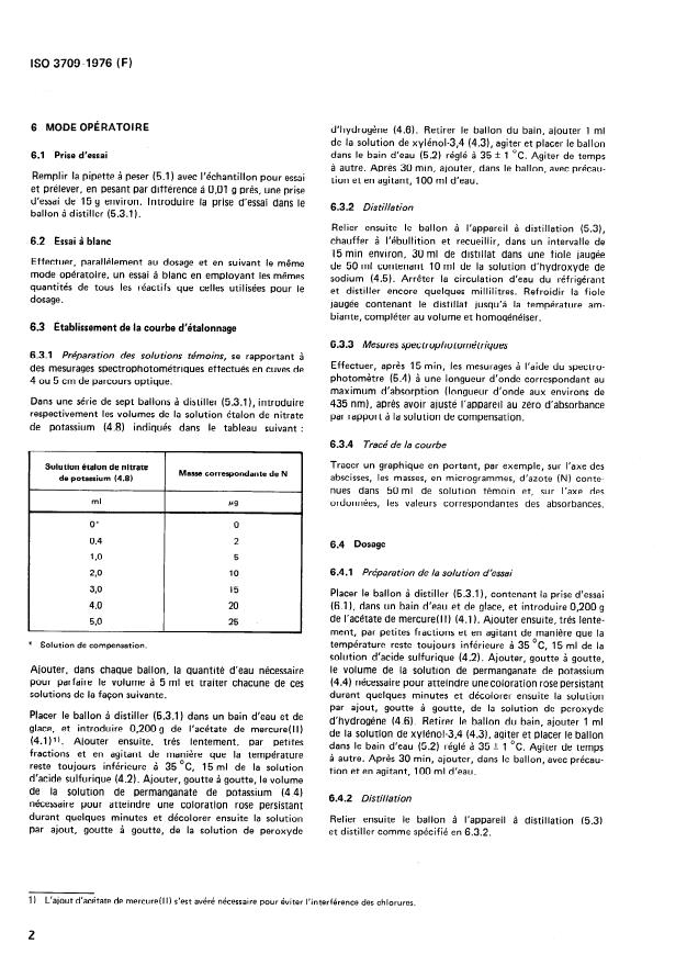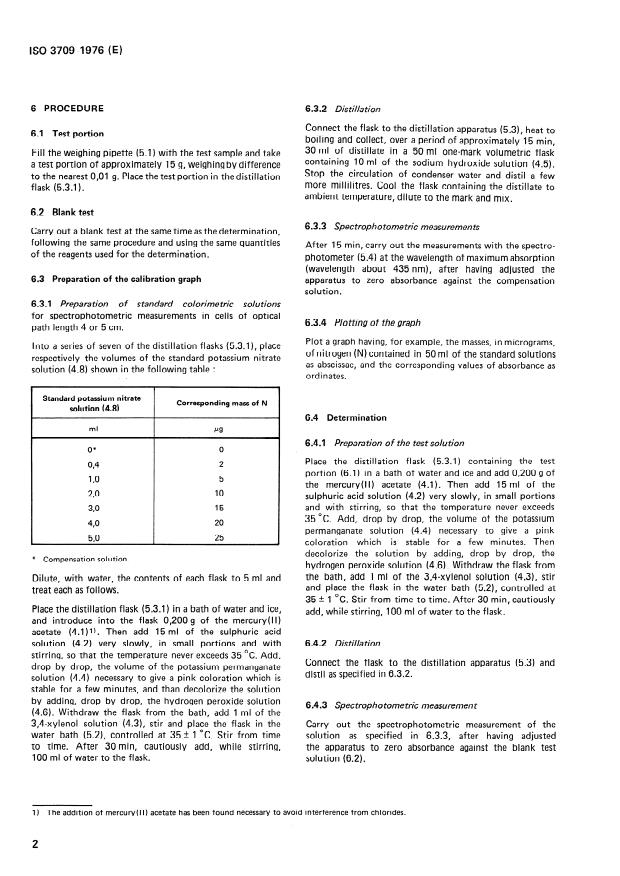 Applicable to products having a content, expressed as N, equal to or more than 0.2 mg/kg. Consists in oxidation of nitrous nitrogen to nitric nitrogen by potassium permanganate and reaction of nitrogen(V) with 3,4-xylenol under specified conditions to form a nitrate derivative. Subsequent destillation of the nitrate derivative and absorption in sodium hydroxide solution. Spectrophotometric measurement of the yellow nitrophenol at a wavelength of about 435 nm.