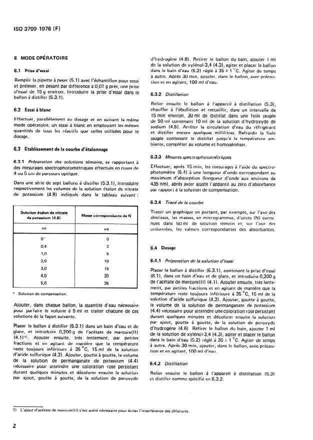 ISO 3709:1976 is a standard published by the International Organization for Standardization (ISO). Its full title is "Phosphoric acid for industrial use (including foodstuffs) — Determination of oxides of nitrogen content — 3,4- Xylenol spectrophotometric method". This standard covers: Applicable to products having a content, expressed as N, equal to or more than 0.2 mg/kg. Consists in oxidation of nitrous nitrogen to nitric nitrogen by potassium permanganate and reaction of nitrogen(V) with 3,4-xylenol under specified conditions to form a nitrate derivative. Subsequent destillation of the nitrate derivative and absorption in sodium hydroxide solution. Spectrophotometric measurement of the yellow nitrophenol at a wavelength of about 435 nm.
