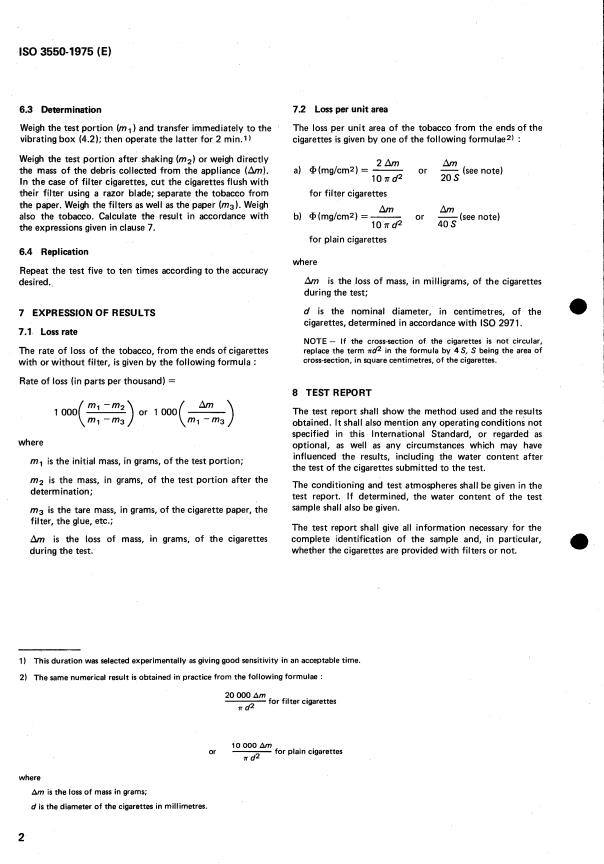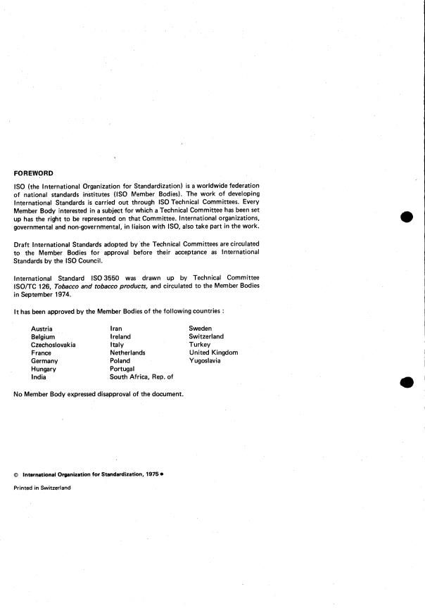 ISO 3550:1975 is a standard published by the International Organization for Standardization (ISO). Its full title is "Tobacco and tobacco products — Cigarettes — Determination of loss of tobacco from the ends". This standard covers: Tobacco and tobacco products — Cigarettes — Determination of loss of tobacco from the ends